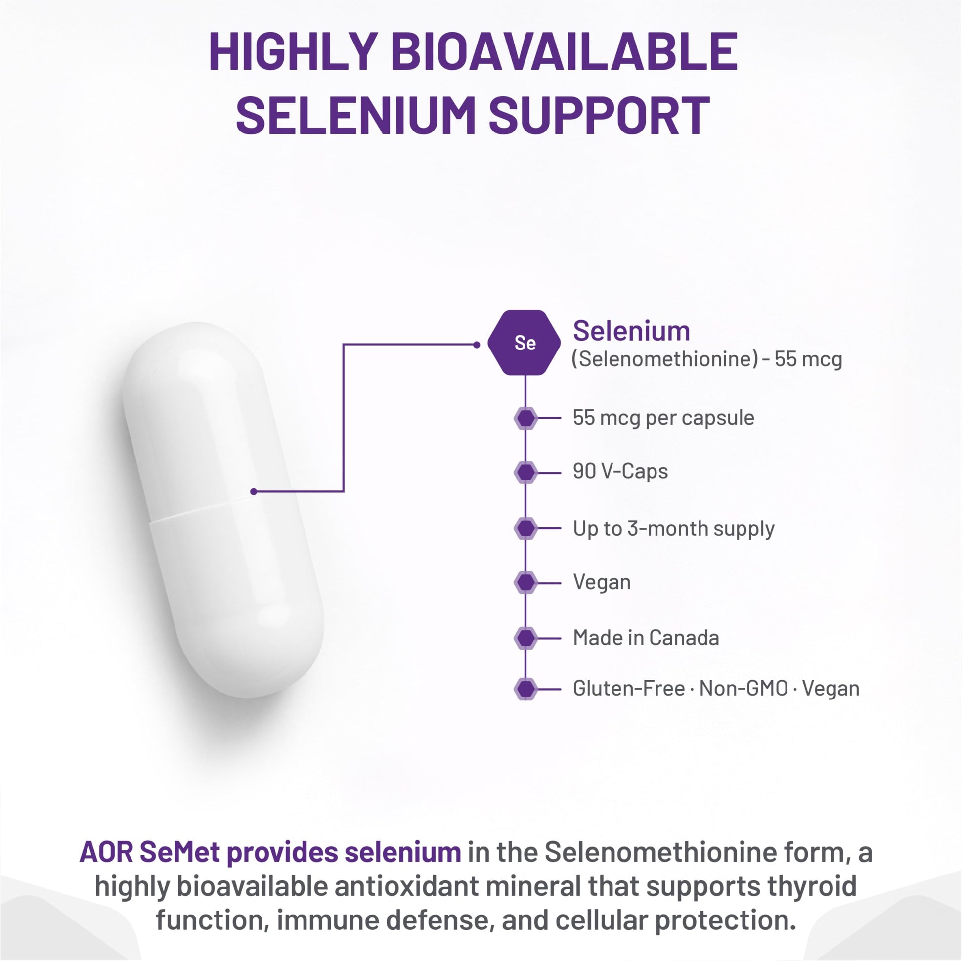 AOR SeMet Selenomethionine 55mcg, 90 Capsules 90-Day Supply - Vegan and Non-GMO - Selenium & Glutathione Formula - Cognitive Function, Cellular Wellness, Thyroid Support and Antioxidant Properties