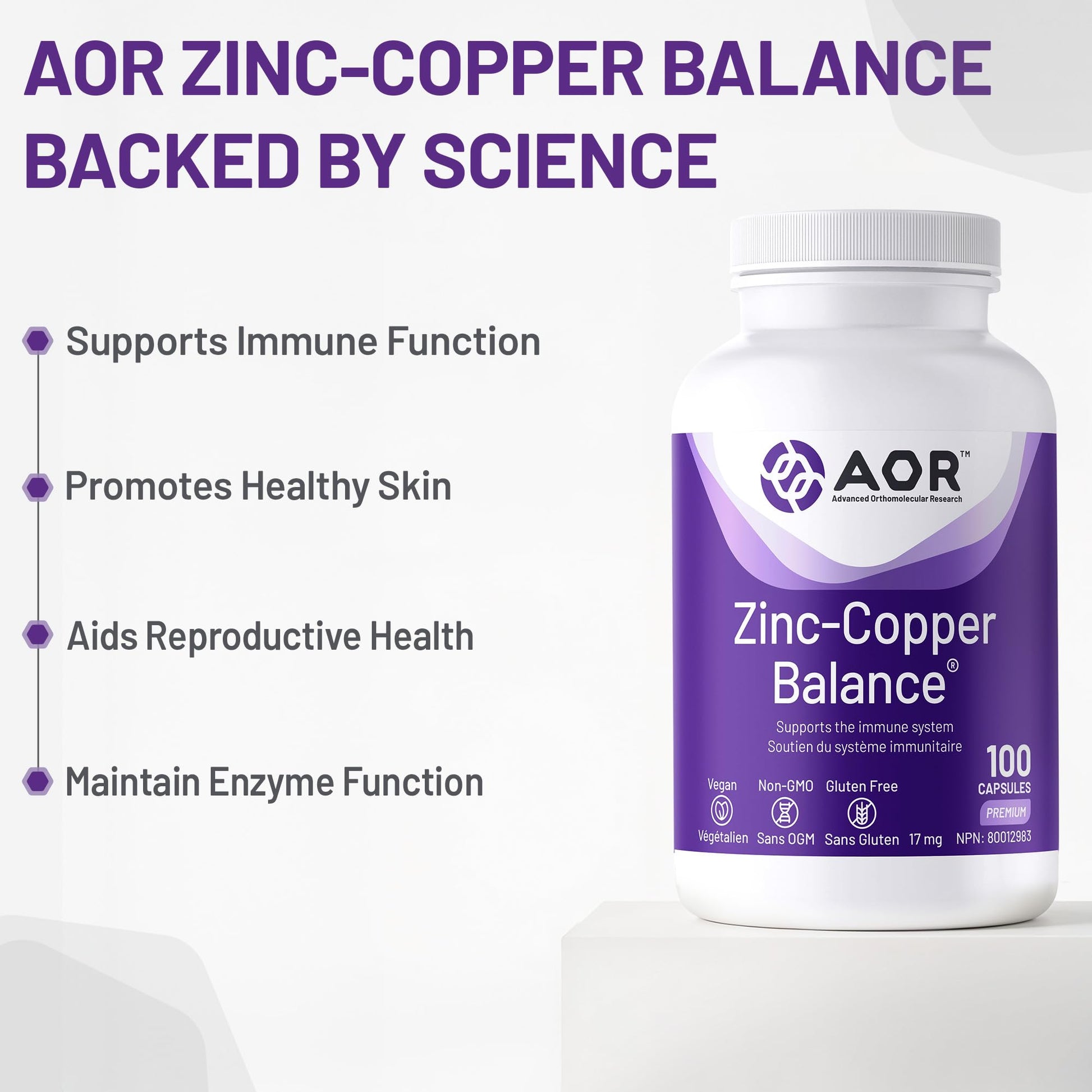 AOR Zinc Copper Balance 17mg, 100 V-Caps, 100-Day Supply - Nutrient Support for Skin, Hair, Bone & Overall Wellness, NON-GMO & Gluten-Free, Easy-to-Swallow, Zinc & Copper Supplements for Men & Women