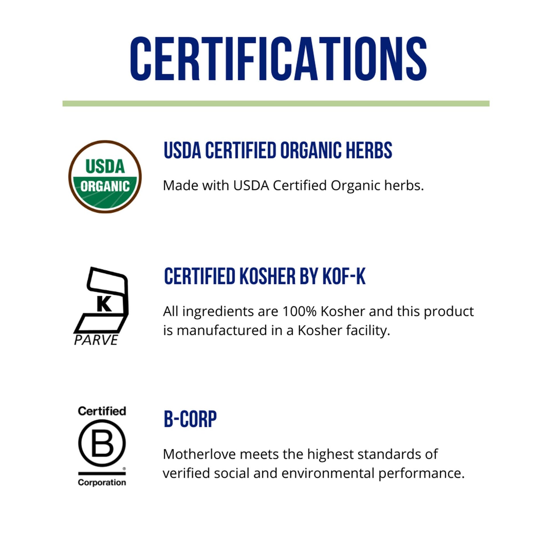 - MOTHERLOVE CARES: As a women-owned, family-run, Certified B Corp, Motherlove cares about people and the planet over profit. This product is made in the USA with imported ingredients, vegan, non-GMO, made with USDA Certified Organic herbs, and Kosher Certified by Kof-K. Manufactured in an NSF-registered GMP facility.