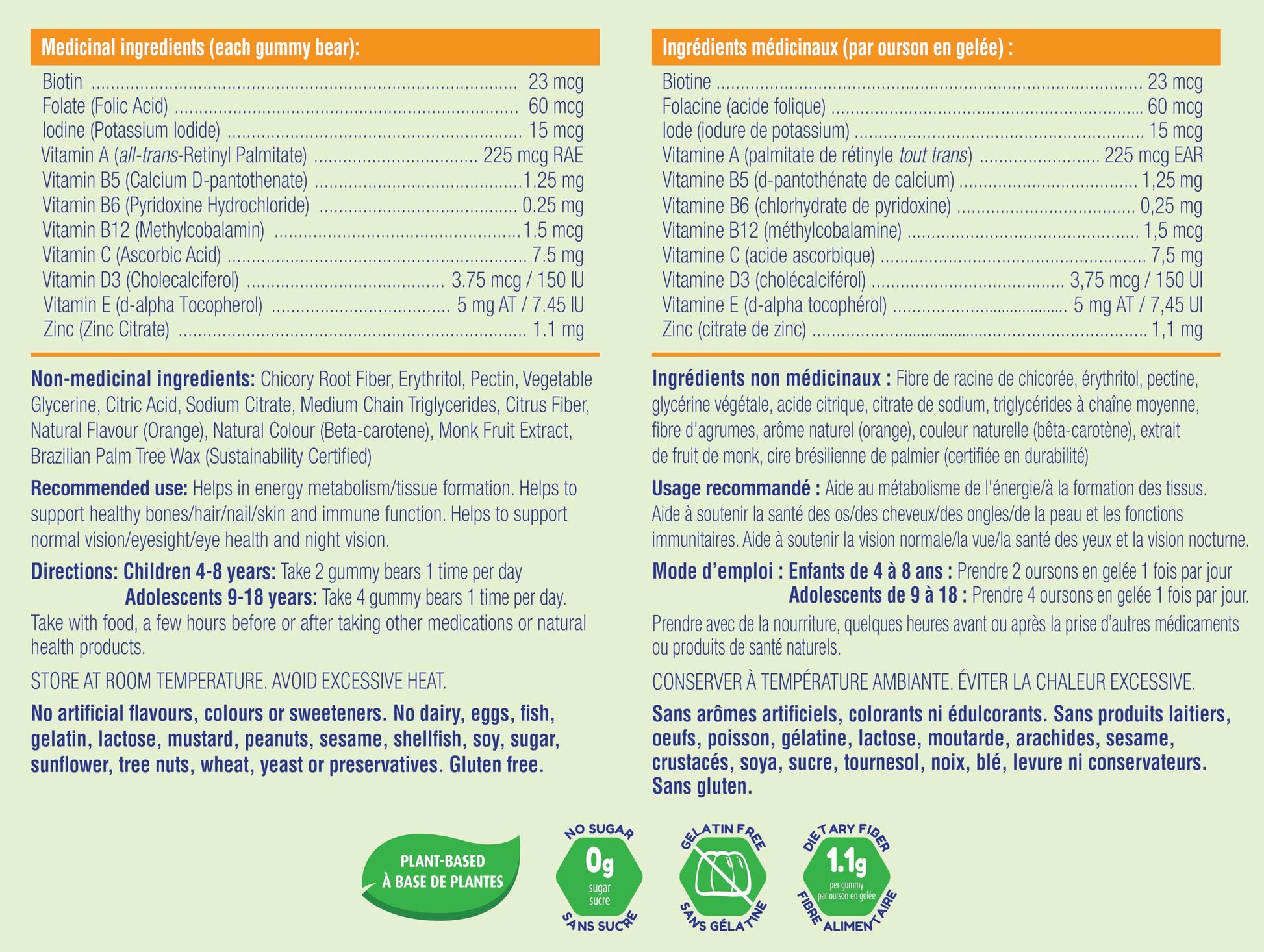 allKiDz Multivitamin Gummy Bears for Kids Children, Made in Canada, Plant-Based, Sugar-Free, Gelatin-Free, Complete Multi Vitamin Mineral Supplement, 11 Essential Nutrients Including Folate, Vitamin A, B, C, D3, E and Zinc for Immune Health, Natural Orang